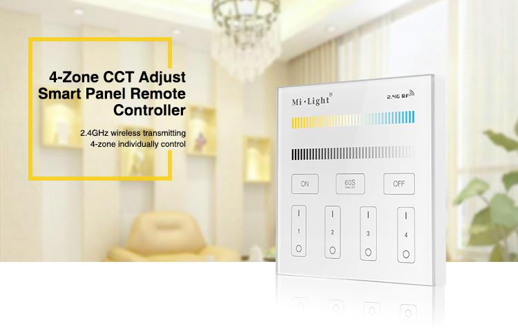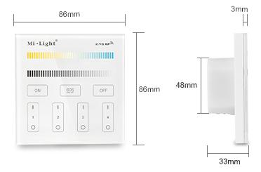 Ściemniacz Kontroler LED naścienny radiowy – 4 STREFOWY - MULTIWHITE CCT, to bezprzewodowy dotykowy panel dedykowany do regulacji jasności produktów LED, włączania/wyłączania oświetlenia oraz zmiany temperatury barwowej Taśmy Multiwhite od Biały Ciepły(3000K) do Biały Zimny (6000K) przeznaczony do montażu naściennego w puszce elektrycznej. Cztery strefy pozwalają na indywidualny dostęp dla każdej ze stref, które mogą być sterowane poprzez zaimplementowany dotykowy szklany panel naścienny.