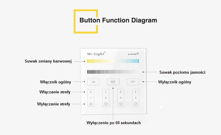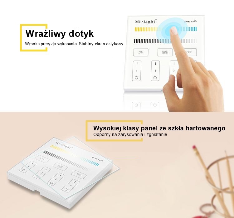Pilot naścienny służy do zarządzania oświetleniem w ramach Inteligentnego systemu, pozwala na sterowanie jasnością oraz temperaturą barwową przy zastosowaniu odpowiednich taśm i żarówek LED. Ma możliwość sterowania aż czteroma odrębnymi strefami, do których można zaprogramować także dodatkowe punkty świetlne. Sterownik posiada szklany hartowany naścienny panel dotykowy. Pozwala na włączania i wyłączanie poszczególnej strefy, ściemnianie i rozjaśnianie, posiada także funkcję opóźnionego wyłączenia o 60 sekund. Zasięg działania sterownika wynosi 30 metrów. Do poprawnego działania systemu należy dokupić sterowniki strefowe