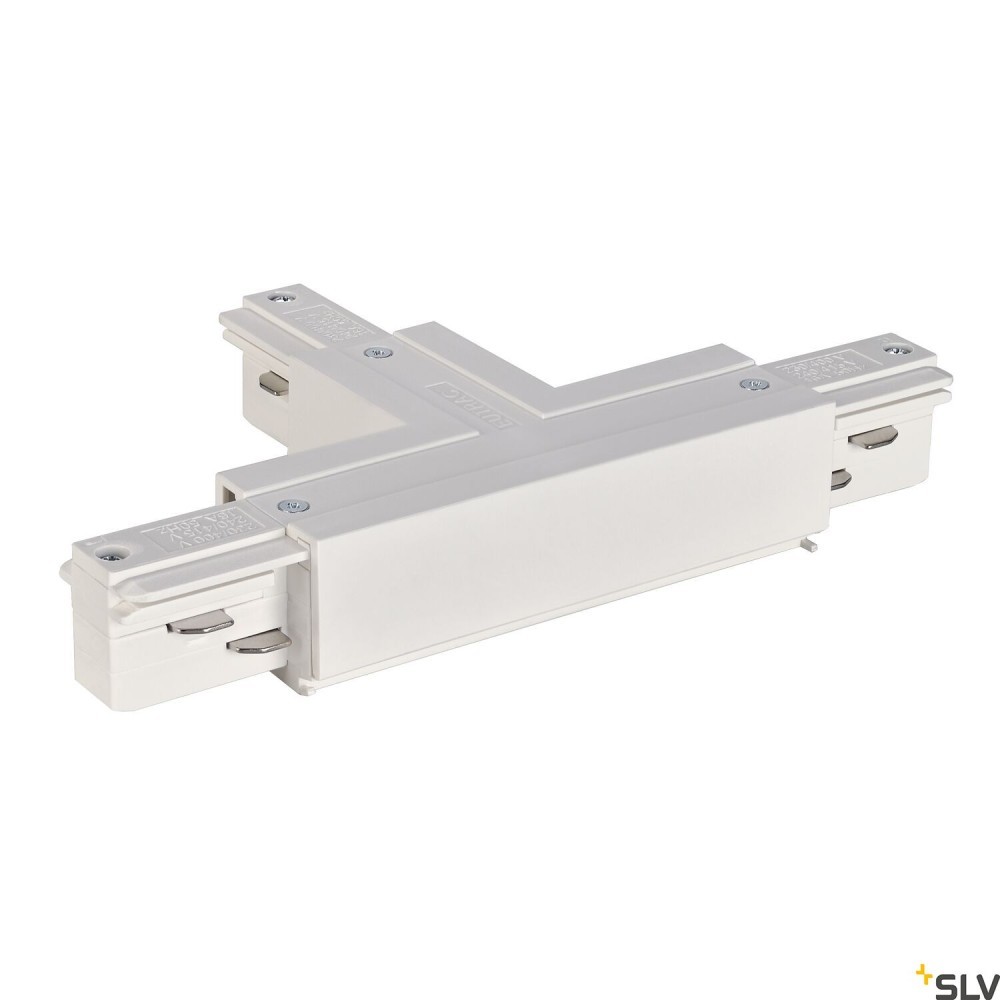 EUTRACK, łącznik T z możliwością zasilania, uziemienie wewnątrz po stronie lewej, zwyczajny biały