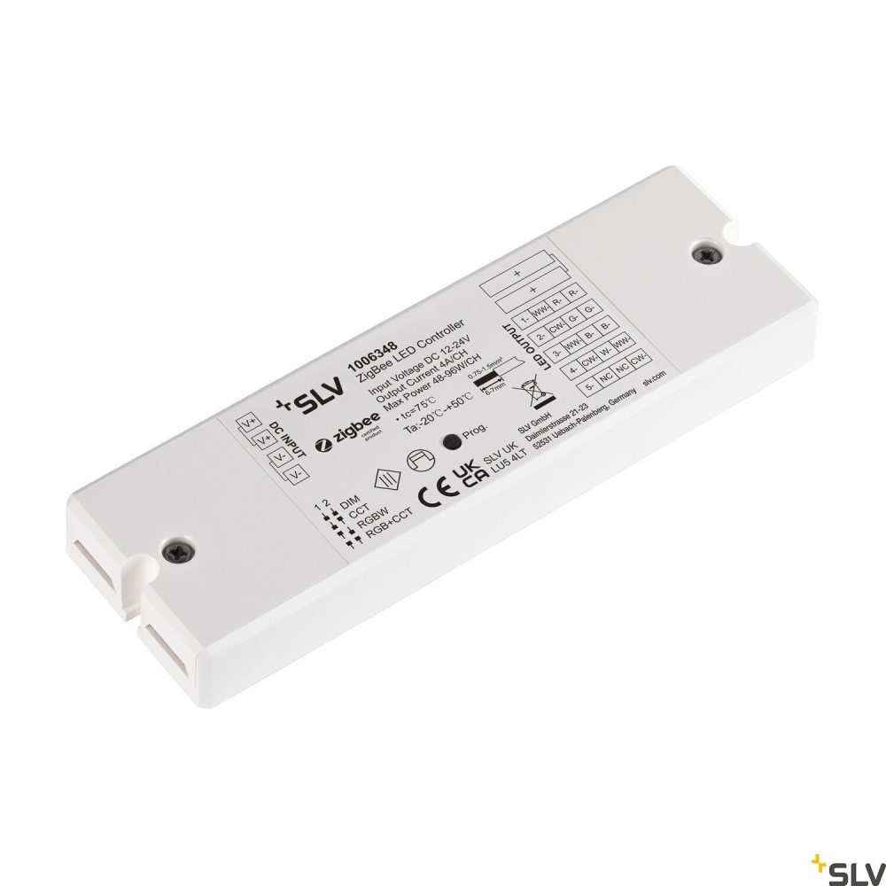SLV Controller umożliwia sterowanie jasnością światła i temperaturą barwową taśm LED w celu dopasowania ich do indywidualnej sytuacji oświetleniowej. Ty decydujesz o rodzaju tonów bieli, od światła dziennego po ciepłe, przyjemne światło. Sterownik 12-24 V jest kompatybilny z ZigBee 3.0.