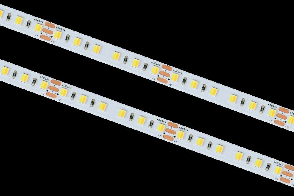 Profesjonalna taśma LED do pracy ciągłej, o skuteczności świetlnej 100lm/W. Diody z możliwością zmiany temperatury barwowej w zakresie 2700-6500K. Dwuwarstwowy podkład PCB o grubości ścieżek miedzianych 3oz charakteryzuje się małymi spadkami napięcia oraz niższą temperaturą pracy. Na podłożu taśma klejąca 3M 300 LSE. Diody spełniające wymagania testu LM-80 gwarantującego niski spadek strumienia świetlnego oraz niezmienność barwy w czasie.