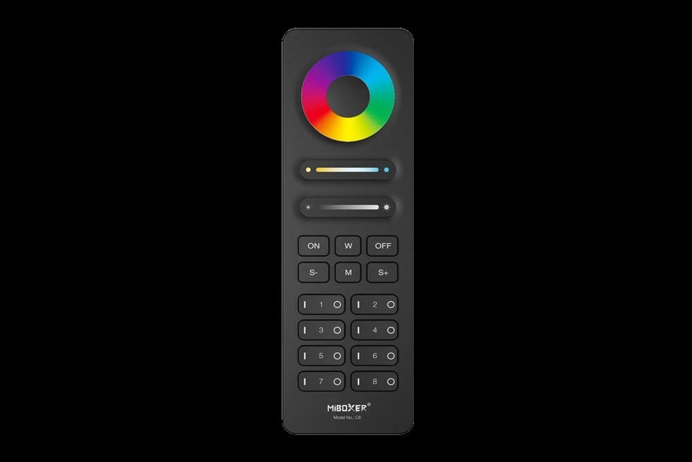Pilot 8-strefowy RGB+CCT C8 to zaawansowane urządzenie do kontroli oświetlenia, pozwalające na wybór spośród 16 milionów kolorów oraz regulację jasności, temperatury barwowej i nasycenia. Dzięki technologii bezprzewodowej 2.4GHz pilot może kontrolować produkty z serii MiBoxer/Mi-Light 2.4G na odległość do 30 metrów. Obsługuje osiem niezależnych stref, umożliwiając kontrolę wielu kontrolerów i lamp. Silna baza magnetyczna ułatwia montaż. Zasilanie: 2xAAA.