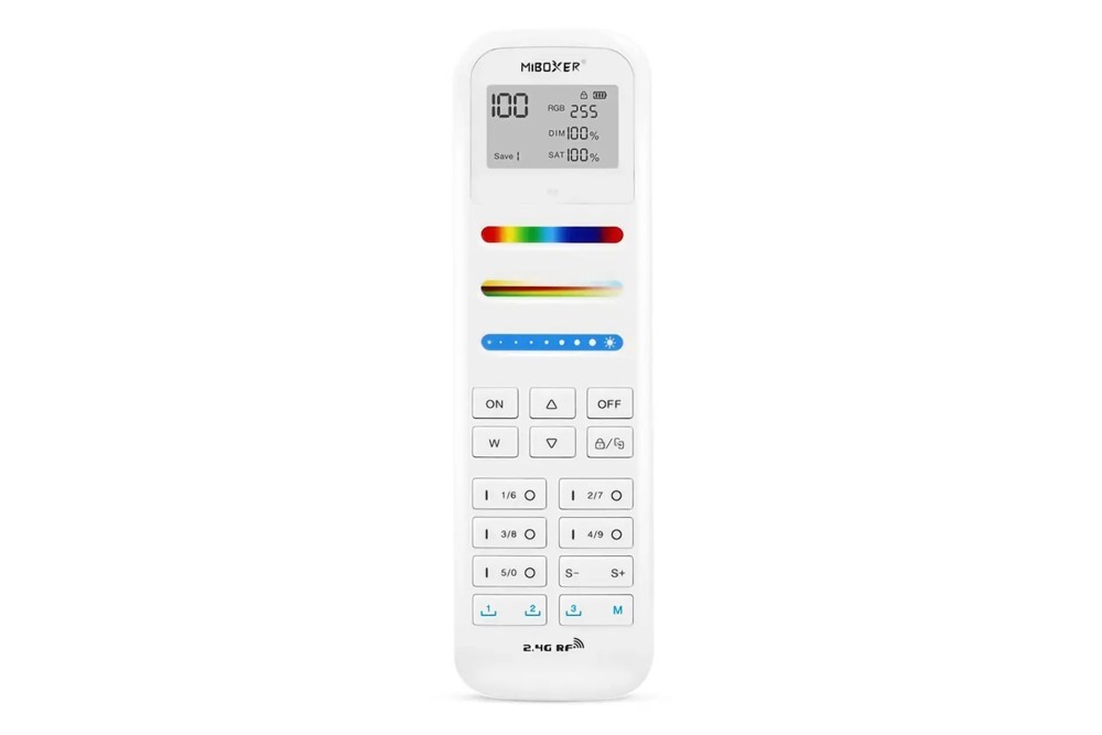 Zaawansowany pilot przeznaczony dla źródeł światła MONO/CCT/RGB/RGBW/RGB+CCT, umożliwia sterowanie stoma strefami, w każdej strefie może współpracować z wieloma sterownikami na raz. Obsługa zapisywania 3 ulubionych kolorów lub trybu dynamicznego. Możliwość płynnej regulacji jasności, koloru światła, oraz temperatury barwowej światła białego.
