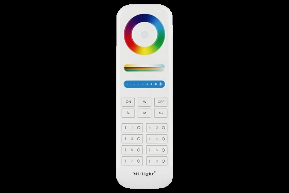 Zaawansowany pilot przeznaczony dla źródeł światła MONO/CCT/RGB/RGBW/RGB+CCT, umożliwia sterowanie ośmioma strefami, w każdej strefie może współpracować z wieloma sterownikami na raz. Możliwość płynnej regulacji jasności, koloru światła, oraz temperatury barwowej światła białego.