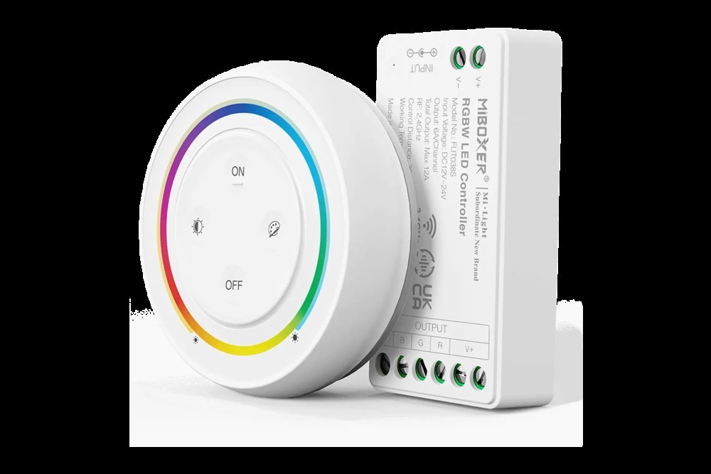 Bezprzewodowy kontroler RGBW FUT038SA LED z pilotem. Kompaktowy, łatwy w montażu, uniwersalny w zastosowaniu w dowolnych instalacjach. Lekki pilot komunikujący się ze sterownikiem za pomocą fal radiowych zapewnia zasięg do 30m. Sterowanie za pomocą pilota lub aplikacji na smartfona (wymagany mostek WiFi WL-BOX2). Zestaw: pilot + sterownik.