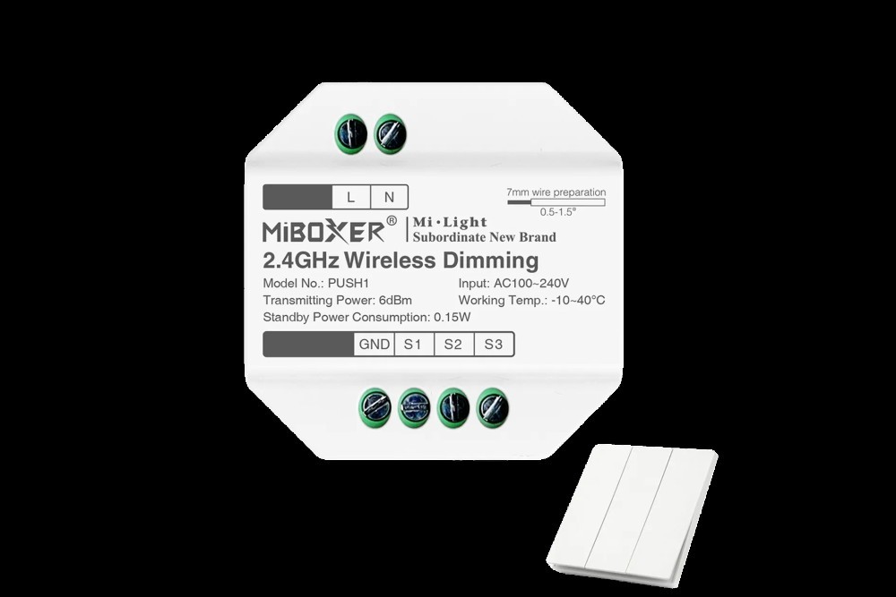 Przekaźnik działa na częstotliwości 2.4GHz RF, co umożliwia bezprzewodową komunikację z lampami i sterownikami LED na odległość do 30 metrów. Urządzenie pozwala na płynne regulowanie jasności, koloru i temperatury barwowej światła, współpracując z dowolnym 3-biegunowym przyciskiem zwiernym (brak z zestawie). Obsługuje 4096 poziomów ściemniania, zapewniając wyjątkową precyzję w dostosowaniu oświetlenia. Kompatybilne z systemami MiBoxer/Mi-Light 2.4G.