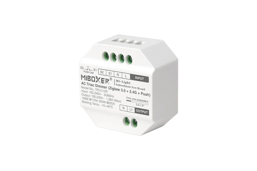 Ściemniacz MONO 100-240V AC 1.36A Zigbee 3.0/2.4G/Push TRI-C1ZR radiowy jest to małych rozmiarów urządzenie służące do sterowania natezeniem oswietlenia 230V AC. Sterowanie za pomocą pilota, aplikacji na smartfona, lub przycisku dzwonkowego do włączenia/wyłączenia, oraz zmiany natężenia światła.