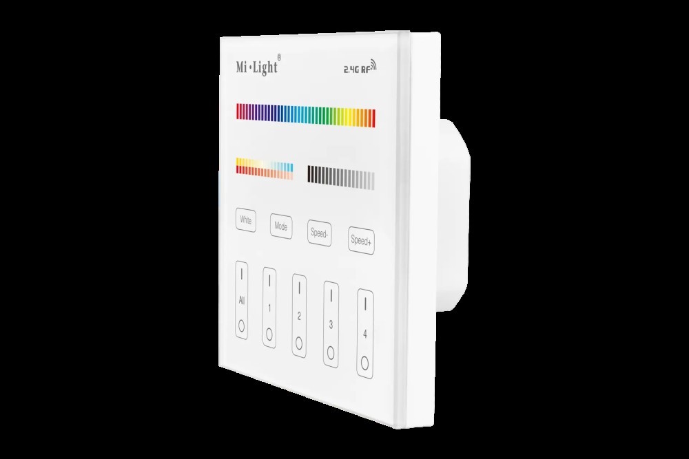 Panel naścienny do regulacji jasności, koloru światła, oraz temperatury barwowej światła białego. Możliwosć sterowania czteroma strefami. Zasilanie 230V.