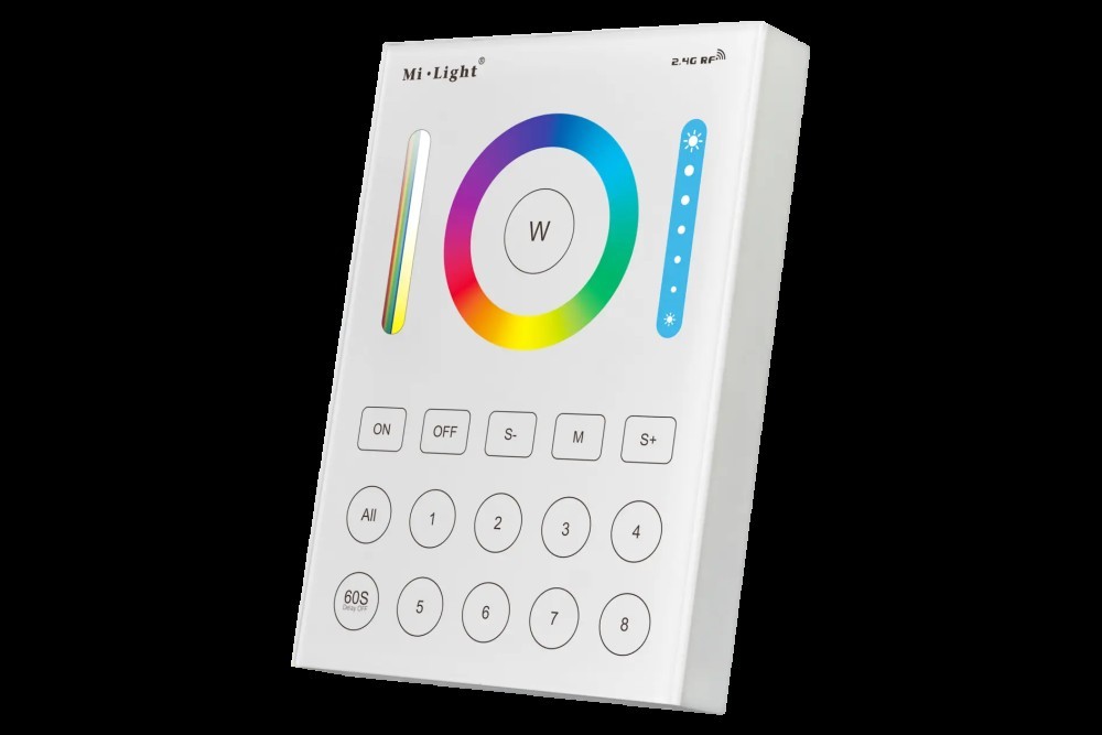 Panel naścienny do regulacji jasności, koloru światła, oraz temperatury barwowej światła białego. Możliwosć sterowania ośmioma strefami. Zasilanie 2xAAA.