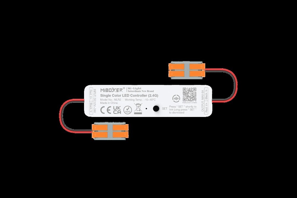 Sterownik MINI MONO 12V-24VDC 6A MLR2 to kompaktowe urządzenie służące do zarządzania jednokolorowym oświetleniem LED. Dzięki niewielkim rozmiarom i prostocie montażu idealnie nadaje się do zastosowań w ograniczonej przestrzeni. Umożliwia płynne ściemnianie oraz rozjaśnianie światła. Sterowanie odbywa się za pomocą pilota lub aplikacji na smartfona (wymagany mostek WiFi WL-BOX2).