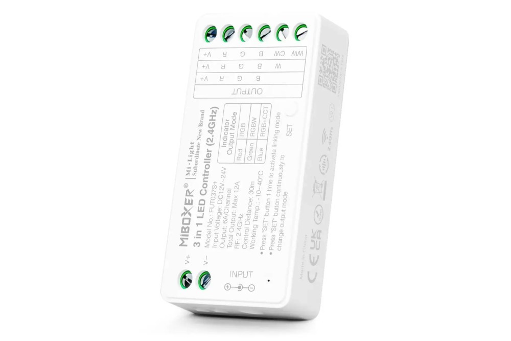 Sterownik 3w1 RGB/RGBW/RGBCCT 12V-24VDC 12A MiLight FUT037S+ jest to małych rozmiarów urządzenie służące do sterowania oświetleniem LED RGB, RGBW, lub RGBCCT. Umożliwia zmianę natężenia światła, koloru oraz temperatury barwowej podłączonej taśmy LED RGB+CCT, Sterowanie za pomocą pilota lub aplikacji na smartfona (wymagany mostek WiFi WL-BOX2). Może pracować w dwóch częstotliwościach wysokiej (8kHz) lub niskie (500Hz).