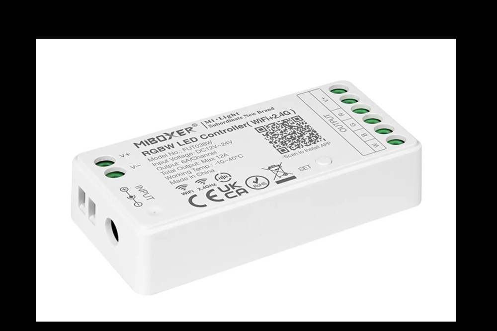 Sterownik RGBW 12V-24VDC 12A MiLight FUT038W WiFi, jest to małych rozmiarów urządzenie służące do sterowania oświetleniem LED RGBW. Umożliwia zmianę natężenia światła oraz koloru podłączonej taśmy LED RGBW, Sterowanie za pomocą pilota lub aplikacji na smartfona. Sterownik pełni funkcję repeatera, co przy zachowaniu 30m odstępów między kolejnymi elementami, pozwala uzyskać nieograniczony zasięg sterowania.