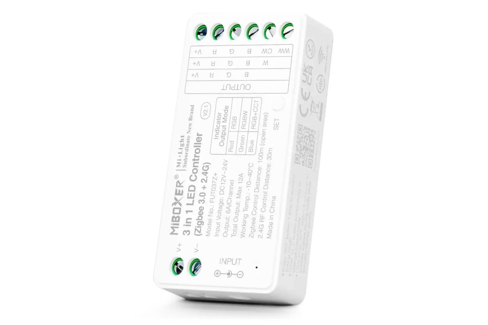 Sterownik RGB/RGBW/RGBCCT 12V-24VDC 12A MiLight FUT037Z+ Zigbee 3.0 umożliwia zmianę natężenia światła, koloru oraz temperatury barwowej podłączonej taśmy LED RGB, RGBW, lub RGBCCT, Sterowanie za pomocą pilota lub aplikacji na smartfona (wymagana bramka Zigbee 3.0).