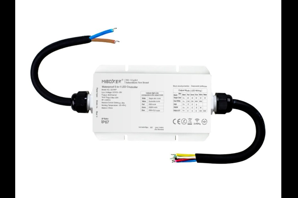 Kontroler LS2-WP wodoodporny IP67 MiLight/MiBoxer jest urządzeniem uniwersalnym przeznaczonym do współpracy z taśmami LED. Typ podłączonej taśmy można ustawić na kontrolerze (RGB+CCT, RGB+W, RGB, CCT, MONO). Kontroler LED LS2-WP pozwala na płynną regulację jasności, koloru światła oraz temperatury barwowej światła białego. Praca urządzenia jest możliwa w zakresie 12-36V DC a maksymalny prąd wyjściowy nie może przekroczyć 20A. Kontroler LED może być sterowany za pomocą pilota lub aplikacji na smartfona (wymagany mostek WiFi WL-BOX2). Dodatkowo kontroler pełni funkcję repeatera, co przy zachowaniu 30m odstępów między kolejnymi kontrolerami, pozwala uzyskać nieskończony zasięg.