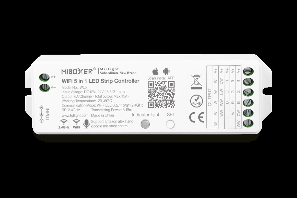 Kontroler WiFi WL5 MiLight/MiBoxer jest urządzeniem uniwersalnym przeznaczonym do współpracy z taśmami LED. Typ podłączonej taśmy można ustawić na kontrolerze łącząc się z nim wcześniej po przez smartphon (RGB+CCT, RGB+W, RGB, CCT, MONO). Kontroler LED WL5 pozwala na płynną regulację jasności, koloru światła oraz temperatury barwowej światła białego. Praca urządzenia jest możliwa w zakresie 12-24V DC a maksymalny prąd wyjściowy nie może przekroczyć 15A (moc 180W przy instalacji 12V i 360W przy instalacji 24V). Kontroler LED może być sterowany za pomocą pilota lub aplikacji na smartfona (mostek WiFi WL-BOX2 nie jest wymagany). Dodatkowo kontroler pełni funkcję repeatera, co przy zachowaniu 30m odstępów między kolejnymi kontrolerami, pozwala uzyskać nieskończony zasięg.
