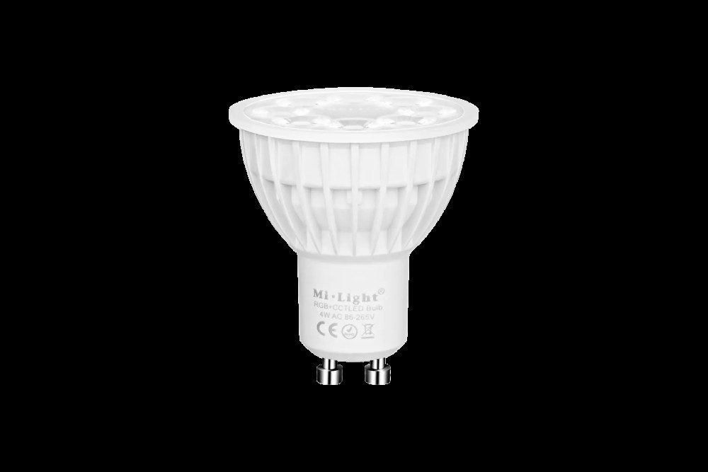 Lampa LED GU10 4W RGB+CCT 230V MiLight/MiBoxer to wielokolorowe źródło światła z możliwością płynnej regulacji jasności, koloru światła, oraz temperatury barwowej światła białego w zakresie 2700-6500K. Sterowanie za pomocą pilota lub aplikacji na smartfona (wymagany mostek WiFi WL-BOX2). Oprawa pełni funkcję repeatera, co przy zachowaniu 30m odstępów między kolejnymi elementami, pozwala uzyskać nieograniczony zasięg sterowania.