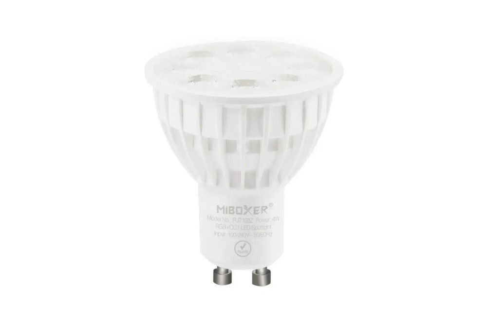 Lampa LED GU10 4W RGB+CCT 230V Zigbee FUT103Z MiLight/MiBoxer to wielokolorowe źródło światła z możliwością płynnej regulacji jasności, koloru światła, oraz temperatury barwowej światła białego w zakresie 2700-6500K. Sterowanie za pomocą pilota lub aplikacji na smartfona (wymagana bramka ZB-BOX).