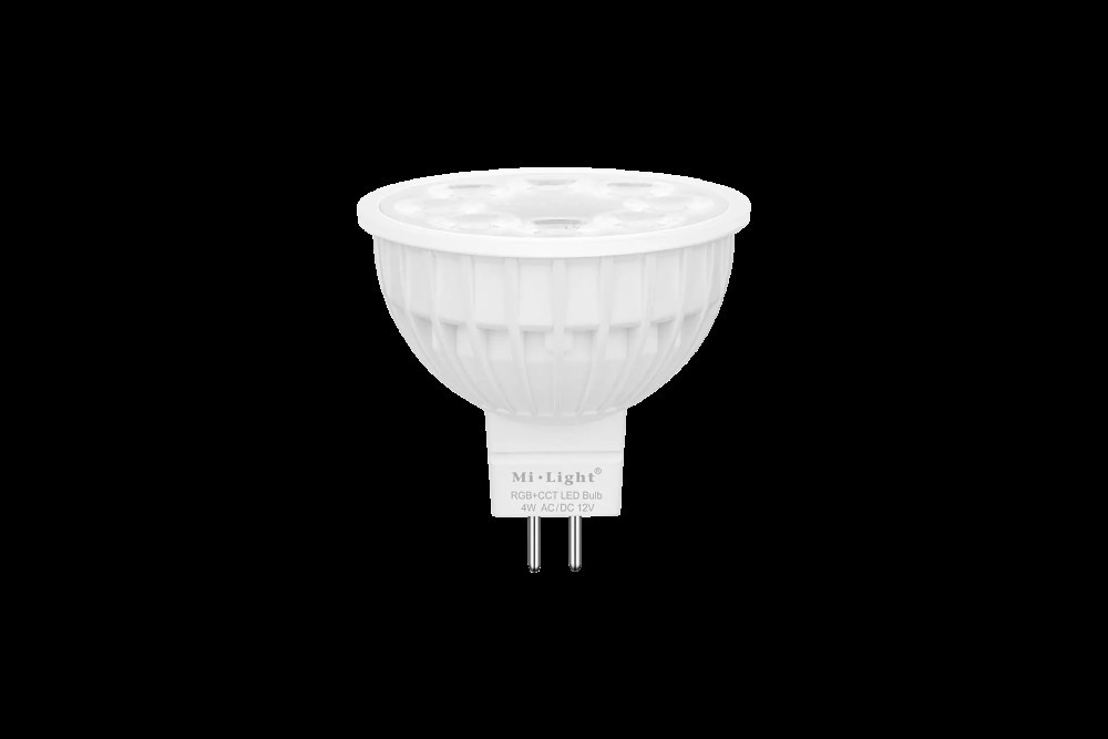 Lampa LED MR16 4W RGB+CCT 12V MiLight/MiBoxer to wielokolorowe źródło światła z możliwością płynnej regulacji jasności, koloru światła, oraz temperatury barwowej światła białego w zakresie 2700-6500K. Sterowanie za pomocą pilota lub aplikacji na smartfona (wymagany mostek WiFi WL-BOX2). Oprawa pełni funkcję repeatera, co przy zachowaniu 30m odstępów między kolejnymi elementami, pozwala uzyskać nieograniczony zasięg sterowania.
