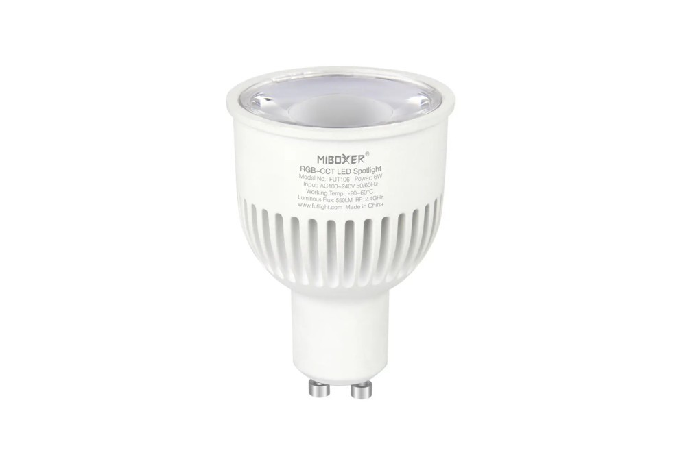Lampa LED GU10 6W RGB+CCT 230V MiLight/MiBoxer to wielokolorowe źródło światła z możliwością płynnej regulacji jasności, koloru światła, oraz temperatury barwowej światła białego w zakresie 2700-6500K. Sterowanie za pomocą pilota lub aplikacji na smartfona (wymagany mostek WiFi WL-BOX2). Oprawa pełni funkcję repeatera, co przy zachowaniu 30m odstępów między kolejnymi elementami, pozwala uzyskać nieograniczony zasięg sterowania.