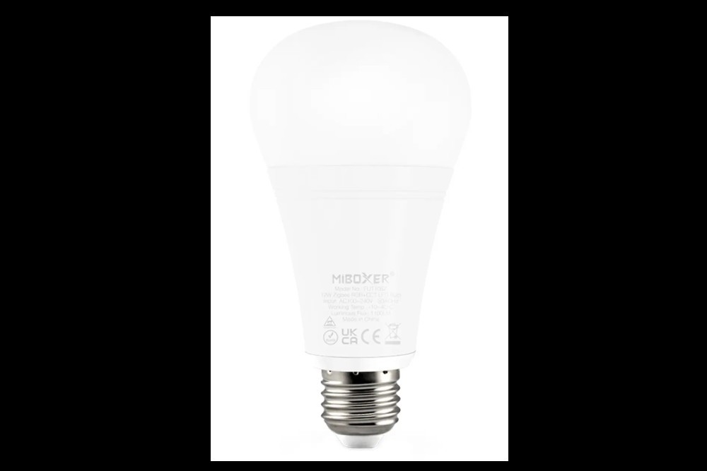 Lampa LED E27 12W MiLight/MiBoxer Zigbee 3.0 zasilany napięciem 110-240V AC. Pozwala na płynną regulację jasności, koloru światła, oraz temperatury barwowej światła białego w zakresie 2700-6500K. Możliwość sterowania za pomocą pilota lub aplikacji na smartfona (wymagana bramka Zigbee 3.0).