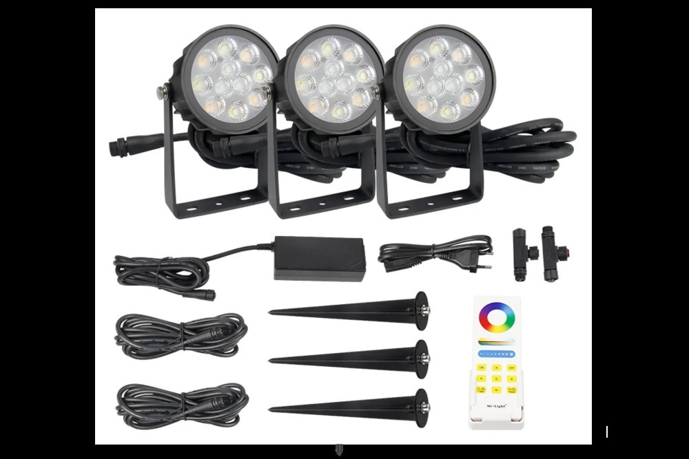 Zestaw trzech sztuk opraw ogrodowych LED RGB+CCT 6W Milight/MiBoxer wraz z zasilaczem, pilotem, oraz przewodami połączeniowymi. Oprawy posiadają możliwość płynnej regulacji jasności, koloru światła, oraz temperatury barwowej światła białego w zakresie 2700-6500K. Posiada wąski kąt rozsyłu światła 25° z regulowanym obrotowym pierścieniem, który umożliwia zmianę kierunku. Sterowanie za pomocą pilota lub aplikacji na smartfona (wymagany mostek WiFi WL-BOX2). Oprawa pełni funkcję repeatera, co przy zachowaniu 30m odstępów między kolejnymi elementami, pozwala uzyskać nieograniczony zasięg sterowania.