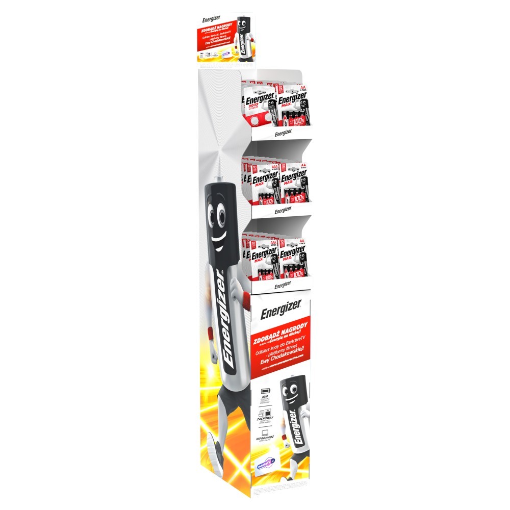 Ekspozytor Energizer MAX. Zawiera 53 sztuki opakowań baterii AA/4; 50 sztuk opakowań baterii AAA/4 oraz 26 sztuk opakowań CR2032/2. Pakiet promocyjny z Ewą Chodakowską.