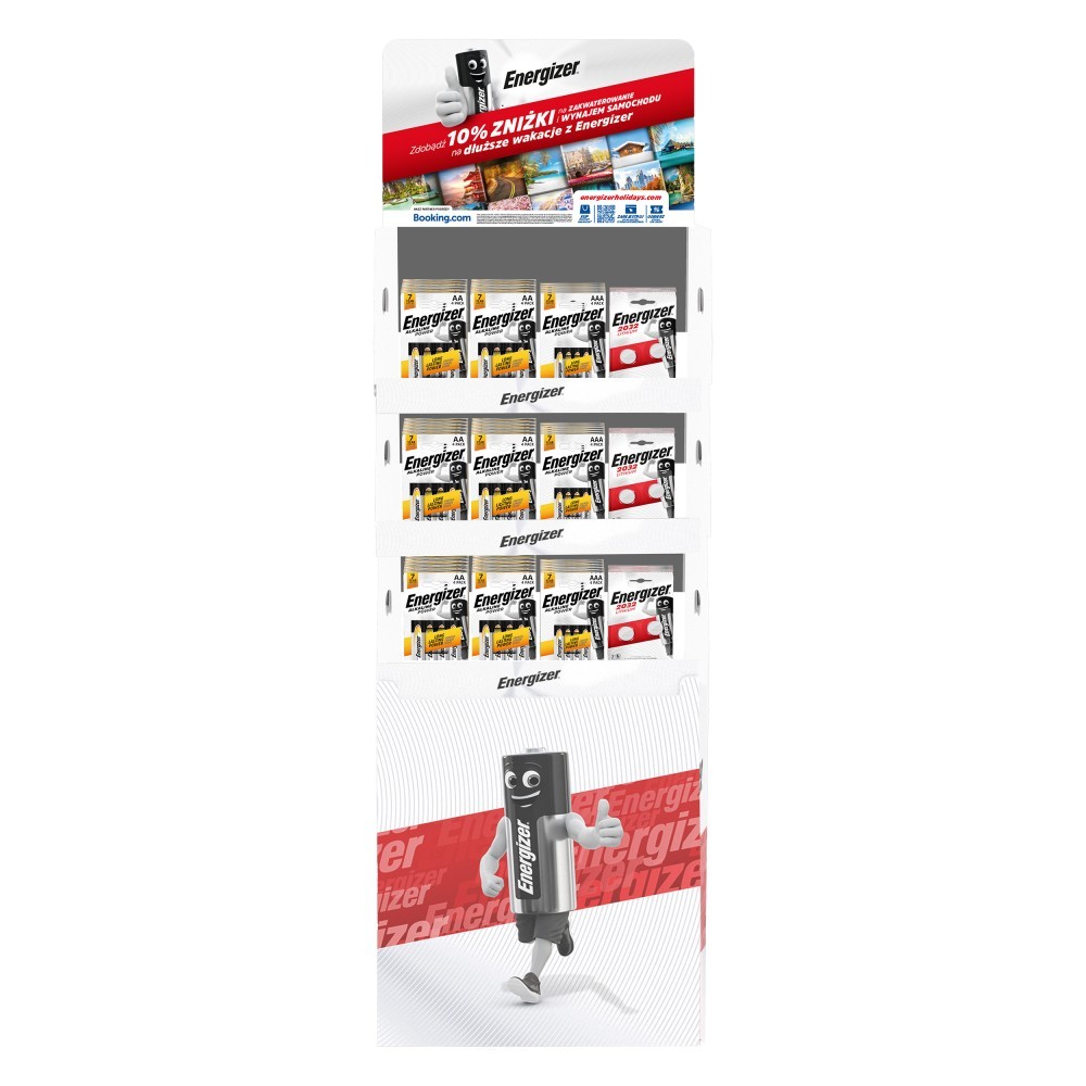 Każdemu czasem brakuje mocy. Dlatego przygotowaliśmy dla Was praktyczne i oszczędzające miejsce displaye wspierające sprzedaż baterii marki ENERGIZER. Chcesz wygodnie i łatwo wyeksponować baterie? Nic prostszego. Z takim standem ekspozycyjnym to nie tylko możliwe ale i skuteczne. Dlaczego? Po pierwsze display eksponuje produkt, mimo niewielkich rozmiarów poszczególnych paczek baterii, a co za tym idzie - poprawia jego widoczność i sprzedaż. Po drugie ułatwia utrzymanie porządku i łatwy dostęp dla zainteresowanych klientów. Po trzecie pozwala sprawnie monitorować głębokość zatowarowania i w razie potrzeby uzupełnić zapasy. Po czwarte - display do baterii zmieści się w niemal każdej przestrzeni, dzięki niewielkim wymiarom łatwo znajdziesz na niego miejsce w półce lub wyeksponujesz nablatowo. Prezentowany model mieści 138 paczek baterii paluszków AA pakowanych po 4 sztuki, 92 paczki baterii AAA również pakowanych po 4 sztuki, 46 blistrów z bateriami CR2032 po 2 sztuki każdy. Minimalne zamówienie: 2 sztuki.