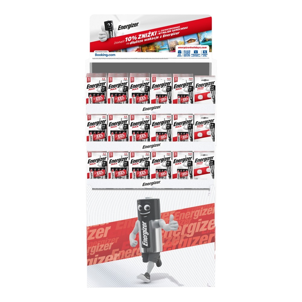 Każdemu czasem brakuje mocy. Dlatego przygotowaliśmy dla Was praktyczne i oszczędzające miejsce displaye wspierające sprzedaż baterii marki ENERGIZER. Chcesz wygodnie i łatwo wyeksponować baterie? Nic prostszego. Z takim standem ekspozycyjnym to nie tylko możliwe ale i skuteczne. Dlaczego? Po pierwsze display eksponuje produkt, mimo niewielkich rozmiarów poszczególnych paczek baterii, a co za tym idzie - poprawia jego widoczność i sprzedaż. Po drugie ułatwia utrzymanie porządku i łatwy dostęp dla zainteresowanych klientów. Po trzecie pozwala sprawnie monitorować głębokość zatowarowania i w razie potrzeby uzupełnić zapasy. Po czwarte - display do baterii zmieści się w niemal każdej przestrzeni, dzięki ergonomicznym wymiarom łatwo znajdziesz na niego miejsce . Prezentowany model mieści: 207 paczek baterii paluszków AA pakowanych po 4 sztuki, 138 paczek baterii AAA również pakowanych po 4 sztuki, 69 blistrów z bateriami CR2032 po 2 sztuki każdy.
