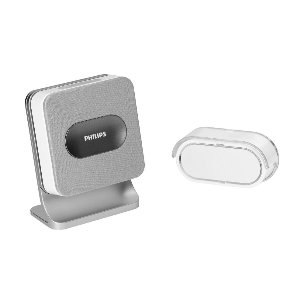 Bezprzewodowy dzwonek Philips WelcomeBell Color posiada 8 rodzajów dzwonka do wyboru. Głośność dźwięku jest regulowana z możliwością całkowitego wyciszenia. Oprócz dźwięków dzwonek posiada wbudowaną sygnalizację świetlną w postaci kolorowych diod LED (6 kolorów do wyboru), które świecą się przy każdorazowym naciśnięciu przycisku wejścia. Możliwość rozbudowy systemu do 4 dzwonków i 4 przekaźników (czujnik otwarcia drzwi/okna, przycisk wejścia, czujnik ruchu). Wysoki stopień ochrony przycisku wejścia (IP65) zapewnia odporność urządzenia na trudne warunki atmosferyczne. Dodatkowe cechy: przycisk włączania trybu nocnego, sygnalizacja zużycia baterii, zakres działania do 300m w terenie otwartym, podświetlany przycisk wejścia z miejscem na nazwisko.