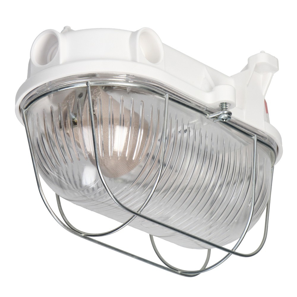 OVAL-7063NB, oprawa oświetleniowa, 75W, E27, IP54, IK10, klosz poliwęglan przeźroczysty, podstawa bakelitowa, siatka metalowa, biała