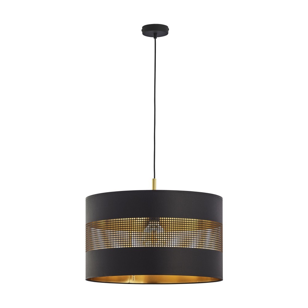 Lampa ALESSIO jest wykonana w nowoczesnym stylu. Czarne abażury wykonane z holenderskiej tkaniny, które od środka zostały powleczone złotą folią pięknie oddają światło, a dodatkowym atutem, są wycinane laserowo drobniutkie otwory w kształcie kwadratu, które przepuszczając światło tworzą na ścianach delikatne wzorki. Dostępna jest także wersja z czterema źródłami światła.