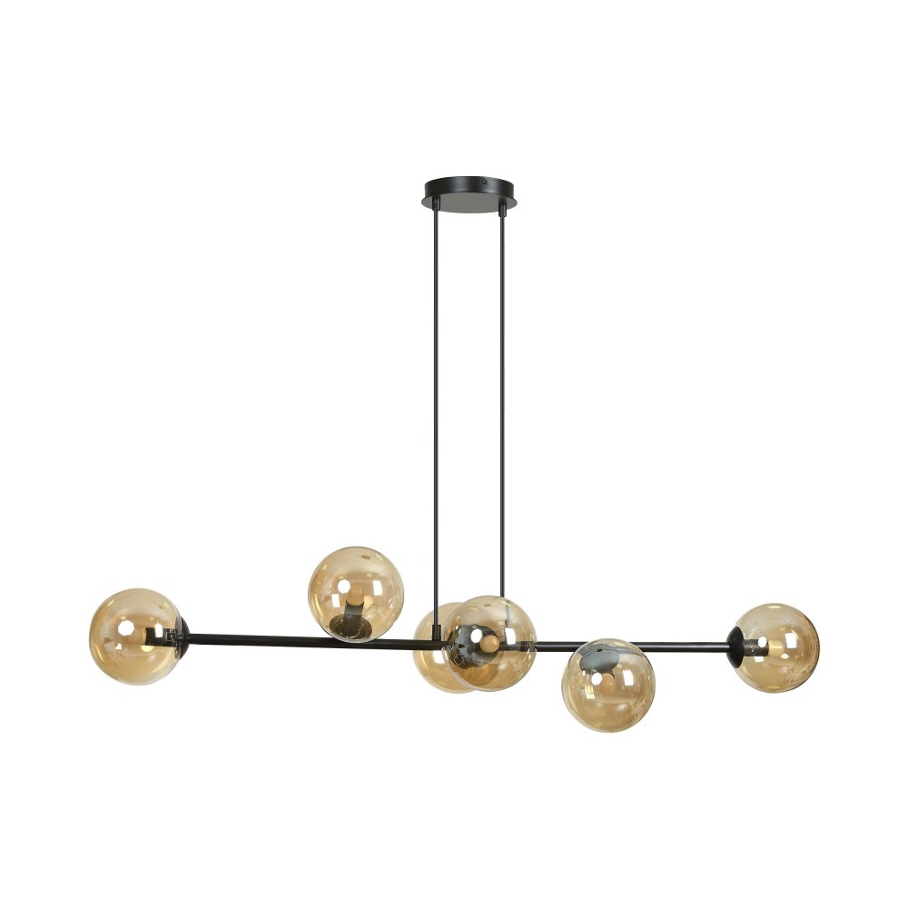 LETO to lampa wisząca przystosowana na 6 żarówek z gwintem E14, o maksymalnej mocy 40W każda (brak w zestawie). Zastosowanie wymiennego źródła światła pozwala każdemu użytkownikowi na indywidualny dobór rodzaju żarówki i na dostosowanie jej barwy światła do własnych preferencji. Pomimo swojej prostej formy, lampa będzie mocnym akcentem dekoratorskim w każdym pomieszczeniu. Zastosowane materiały – czarny stalowy korpus oraz klosze z przezroczystego szkła o złotym odcieniu – nadają lampie bardzo futurystycznego sznytu. Produkt nadaje się do montażu natynkowego w pomieszczeniach suchych. Wyprodukowano w Polsce.