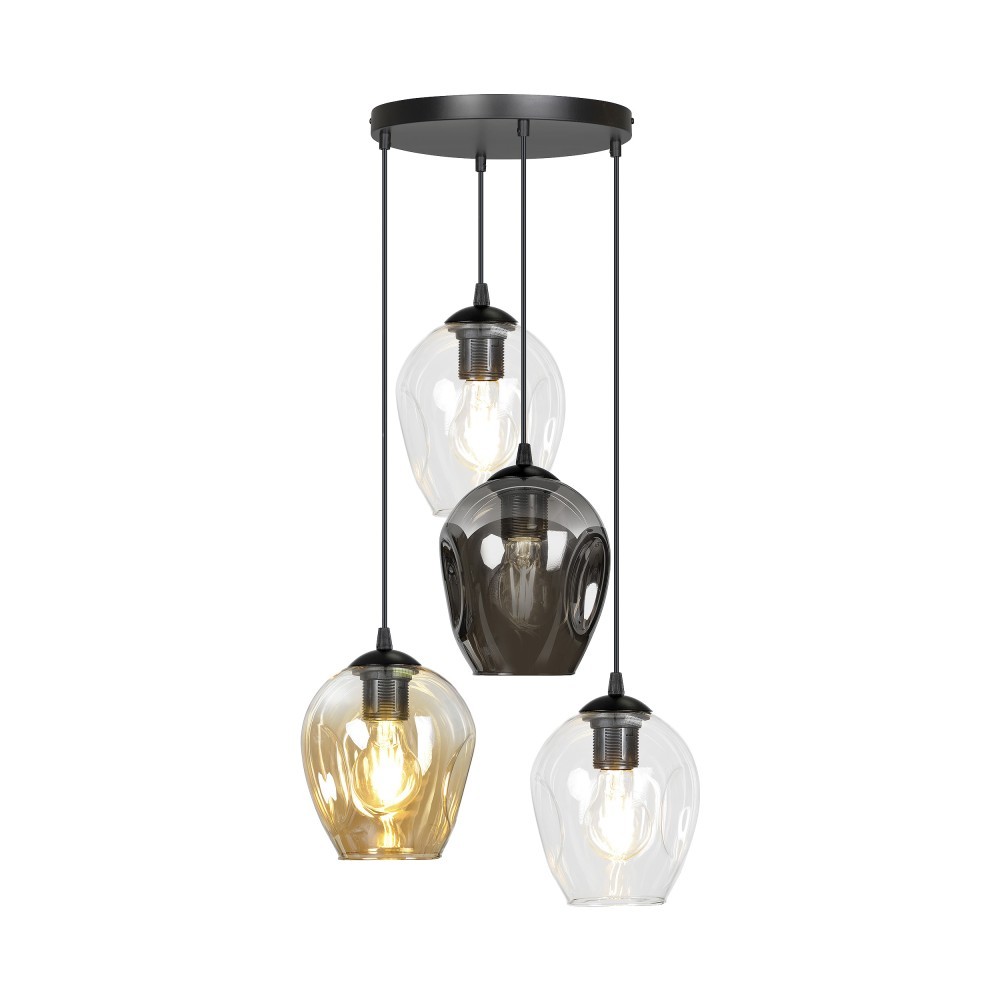 IRIS to lampa wisząca przystosowana na 4 żarówki z gwintem E27, o maksymalnej mocy 60W (brak w zestawie). Zastosowanie wymiennego źródła światła pozwala każdemu użytkownikowi na indywidualny dobór rodzaju żarówki i na dostosowanie jej barwy światła do własnych preferencji. Lampa ma bardzo charakterystyczną formę. Składa się z czterech owalnych kloszy, wykonanych ze szkła w rożnych kolorach (grafitowym, transparentnym oraz złotym), które mają po bokach dekoracyjne wgłębienia. Klosze lampy dekoracyjnie rozpraszają światło w dół, dlatego warto zastosować żarówki typu filament, które dodają jej industrialnego sznytu. Takie rozwiązanie pozwoli uzyskać efekt, który będzie mocnym akcentem dekoratorskim i z pewnością będzie przykuwać uwagę. W naszej ofercie dostępne są również warianty kolorystyczne szklanych kloszy: grafitowe, transparentne, złote oraz mix kolorów. Produkt przystosowany do montażu natynkowego w pomieszczeniach suchych. Wyprodukowano w Polsce.