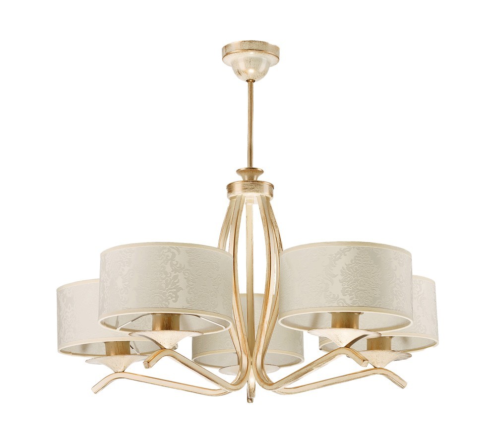 Seria lamp ARCADIA to wyjątkowe oświetlenie dla każdego, kto chce wprowadzić do swojego wnętrza niepowtarzalny design. Każda lampa z tej serii wyróżnia się swoją elegancją i ciekawym wykończeniem, a to sprawia, że są nie tylko źródłem światła, ale również pięknym i wyszukanym elementem dekoracyjnym. W serii znajdują się dwie lampy wiszące o trzech i pięciu źródłach światła oraz kinkiet ścienny. Wszystkie lampy ARCADIA wykonane są z metalu, co zapewnia im solidność i trwałość. Kolor écru, który dominuje w każdej z lamp, dodaje wnętrzom delikatności i subtelności. Wzorzysty abażur sprawia, że stają się wyjątkowym elementem przestrzeni, w której się znajdują. Prezentowana lampa ARCADIA 5P jest lampą wiszącą, która może pomieścić aż pięć źródeł światła typu E27 o max. mocy 60W każde. Ta lampa jest doskonałym rozwiązaniem do większych przestrzeni, takich jak hol czy przestronny salon. Możliwość samodzielnego wyboru odpowiednich żarówek pozwala dostosować światło do własnych preferencji.