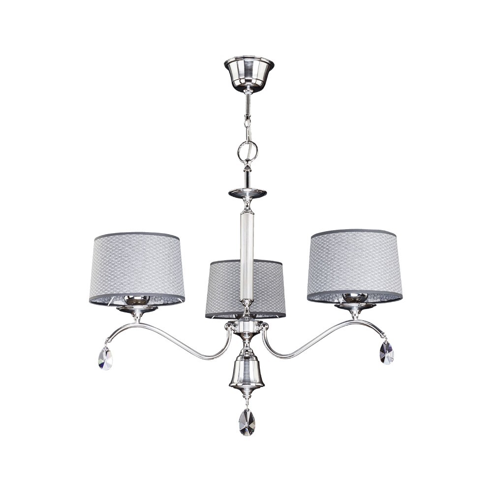 Seria lamp ACHAJA to kompletne oświetlenie, które łączy w sobie elegancję i funkcjonalność. Wyróżnia ją ciekawy design w postaci wiszących szklanych kamieni zwieńczających ramiona lampy, tworząc niezwykły element dekoracyjny, który nadaje lampom niepowtarzalność. Seria składa się z lamp wiszących, wyposażonych w trzy lub pięć gniazd oraz kinkietu ściennego. Każda lampa z tej kolekcji emanuje wyjątkowym stylem i doskonałą jakością wykonania, dzięki czemu są idealnym dodatkiem do każdego wnętrza. Kolekcja ACHAJA została wykonana z solidnego metalu, co gwarantuje ich trwałość. Ponadto każda z lamp wyposażona jest w piękny abażur, który nadaje oświetleniu elegancji. Dostępne w dwóch wariantach – mosiądz połączony z czarnym abażurem i czarnymi kamieniami oraz chrom połączony z szarym abażurem i bezbarwnymi kamieniami. Prezentowana lampa ACHAJA 3P, to lampa wisząca, wyposażona w trzy gniazda E27, które pozwalają na zastosowanie trzech żarówek o max. mocy 60W każda. Swoboda w wyborze żarówki umożliwia dopasowanie oświetlenia do własnych preferencji. Oprawa posiada trzy abażury w kolorze szarym oraz metalowe wykończenie pokryte warstwą chromu z wiszącymi, bezbarwnymi kamieniami wykonanymi ze szkła. Lampa doskonale sprawdzi się w salonie, sypialni czy jadalni, tworząc jednocześnie element dekoracyjny całego pomieszczenia.