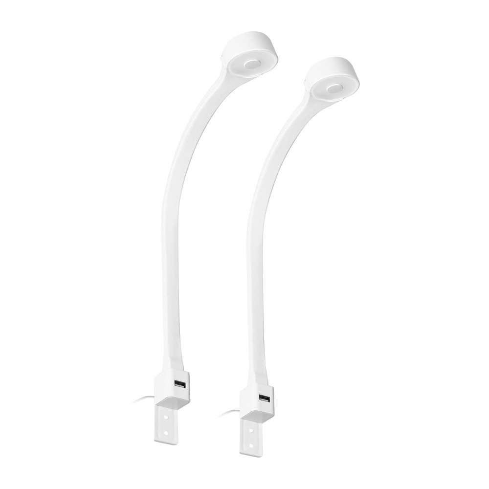 Zestaw dwóch lampek nocnych TEO LED, o mocy 1,8W każda. Doskonale sprawdzią się jako oświetlenie przy łóżku, lub jako lampki biurkowe. Podstawową zaletą tych lamp jest elastyczny wysięgnik, który umożliwia ustawienie lub pochylenie lampy w dowolnej pozycji. Zamontowana z boku łóżka zapewni dobre oświetlenie podczas wieczornej lektury, a możliwość kierowania światła w różnych kierunkach zapobiegnie oślepianiu osoby śpiącej obok. Każda lampa emituje światło o strumieniu świetlnym 90 lm, o przyjemnej neutralnej barwie 4000K. Lampa posiada także port USB, który przy ładowaniu zewnętrznych urządzeń pobiera maksymalnie 7,5W. Lampka montowana jest za pomocą dwóch śrub dołączonych do zestawu. Obsługa lampki jest bardzo prosta, wystarczy nacisnąć włącznik wbudowany w górną część lampki. Zestaw posiada również zasilacz sieciowy o mocy 15W i długości 2 m. Kolor biały.
