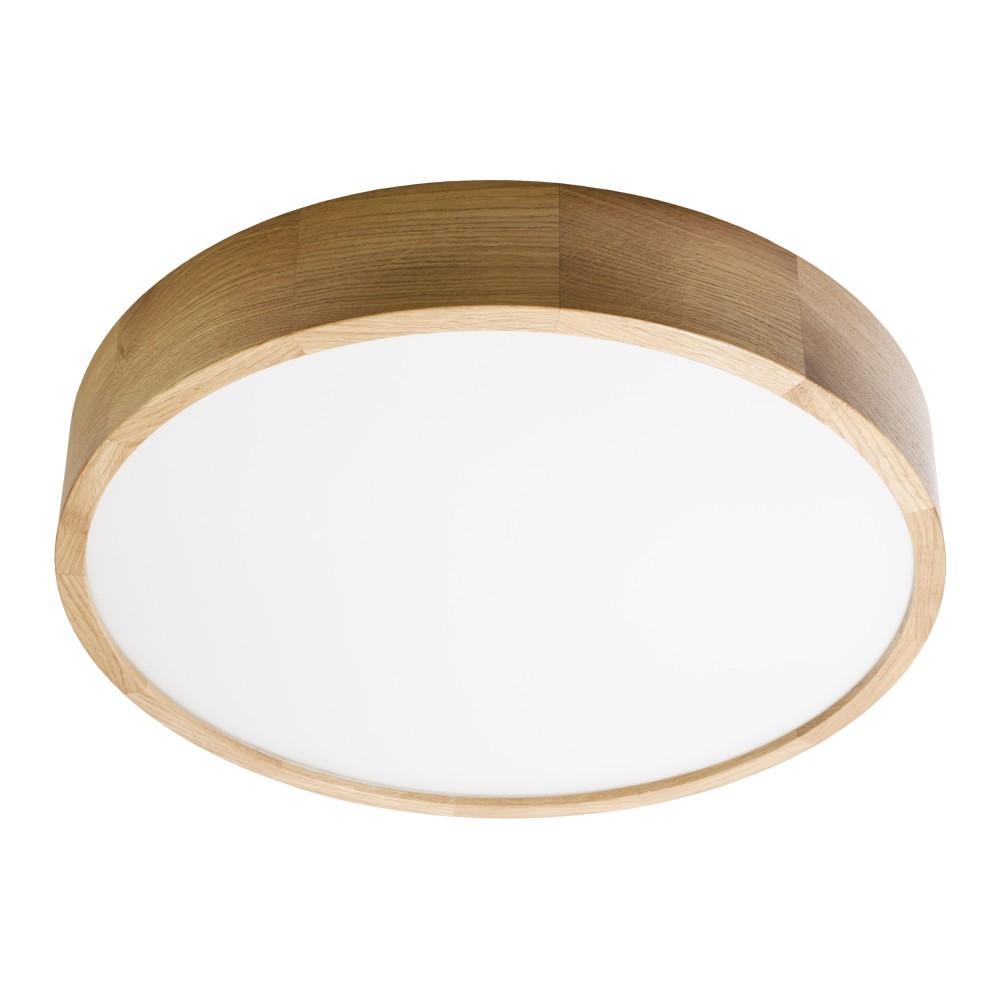 Plafon oświetleniowy OVO o maksymalnej mocy świecenia 4 x 24W, przystosowany jest na 4 wymienne źródła światła z gwintem E27 (brak w zestawie). Takie rozwiązanie pozwala każdemu użytkownikowi dobrać żarówki o kształcie i barwie światła odpowiadającej własnym potrzebom. Produkt składa się z drewnianej, dębowej obręczy oraz klosza wykonanego z matowego szkła. Klosz ma klasyczny okrągły kształt, dlatego taka lampa jest odpowiednia do montażu zarówno na suficie, jak i na ścianie. Ciekawy efekt wizualny otrzymamy poprzez zestawienie kilku takich lamp blisko siebie. Zastosowanie uniwersalnego wzornictwa przekłada się na szerokie spektrum miejsc, w których produkt można użyć. Pasuje zarówno do pomieszczeń domowych, jak i biurowych. Sprawdzi się również w przestrzeniach wspólnych, takich jak korytarze i klatki schodowe. Produkt jest odpowiedni do zastosowania w pomieszczeniach suchych (IP20). Wymienne źródła światła (brak w zestawie) czynią z tej oprawy produkt na lata, który nie stanie się bezużyteczny przy pierwszej awarii. Średnica plafonu wynosi 47,5 cm.
