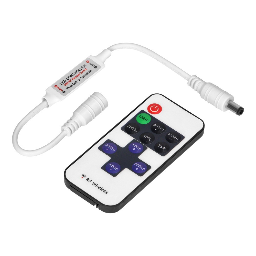 Sterownik z pilotem jest podstawowym elementem wszystkich akcesoriów do taśm LED mono (jednokolorowych). Pozwala na bezprzewodowe sterowanie oświetleniem w zależności od preferencji. Pilot umożliwia włączanie i wyłączanie oświetlenia. Wyposażony jest w 8 programów dynamicznych i 10 poziomów prędkości programów. Komunikacja między sterownikiem, a pilotem odbywa się drogą radiową – RF. Takie rozwiązanie pozwala na większy zasięg działania pilota, do 15 metrów. Kontroler o stopniu ochrony IP20 przeznaczony jest do pracy wewnątrz pomieszczeń. Maksymalna moc taśmy LED przy napięciu 12V, nie może przekroczyć 72W.