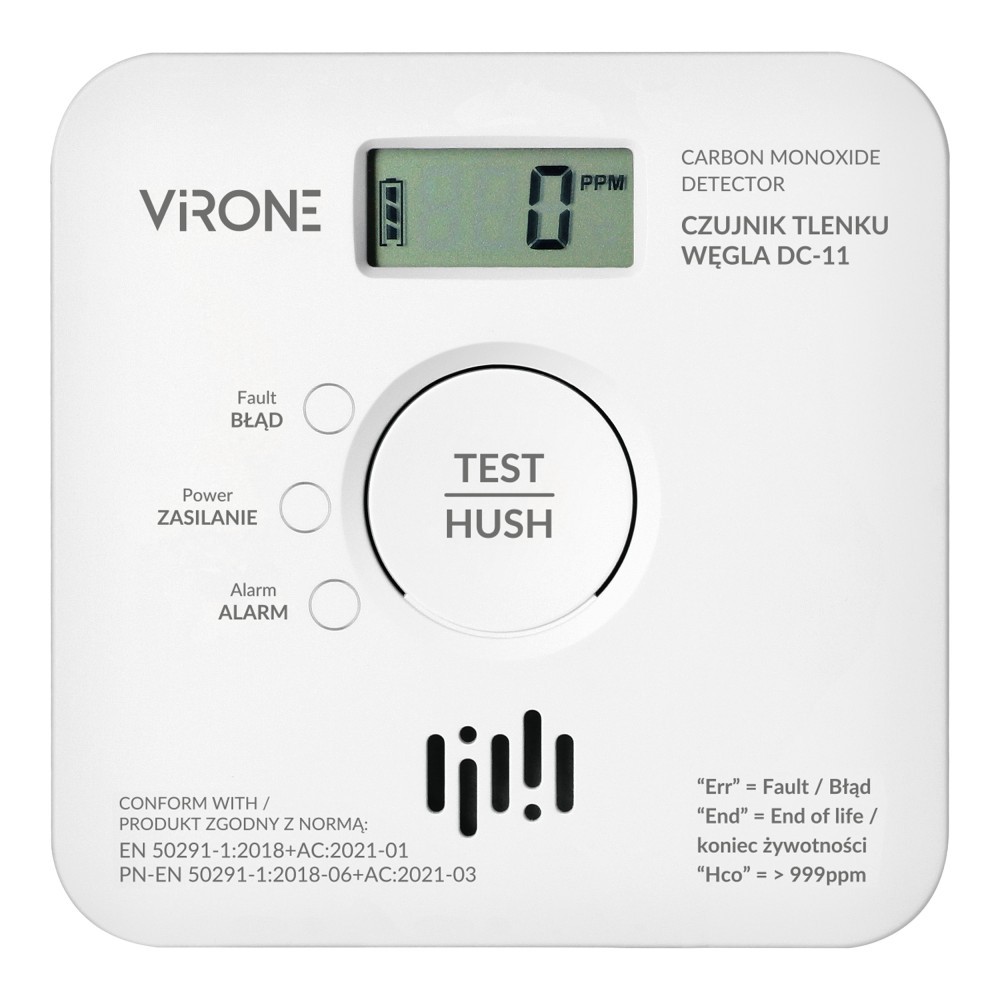 Bateryjny czujnik tlenku węgla (czadu) to nowoczesne urządzenie alarmowe zaprojektowane do stałej kontroli stężenia tlenku węgla. Przystosowany do wewnątrz, w przestrzeniach szczególnie narażonych na zagrożenia mogące powstać w wyniku awarii lub braku odpowiedniej wentylacji. Urządzenie posiada duży wyświetlacz LCD, który sygnalizuje poziom wykrytego zagrożenia (czadu), a także niski stan baterii oraz koniec okresu eksploatacji. Ma wbudowany czujnik elektrochemiczny, który bardzo precyzyjnie wskazuje poziom tlenku węgla używając powiadomień optyczno-dźwiękowych. Produkt posiada podświetlany przycisk TEST, który pozwala sprawdzić poprawność działania czujnika. Detektor tlenku węgla powinien być umieszczony na wysokości oczu, w najczęściej używanym pomieszczeniu, np. kuchni, salonie czy korytarzu, by obiektywnie ocenić ilość cząsteczek czadu we wdychanym powietrzu. Żywotność czujnika wynosi 10 lat. Model zasilany przez dwie baterie AA (dołączone do zestawu). Zgodność z normami EN 50291-1:2018+AC:2021-01 oraz PN-EN 50291-1:2018-06+AC:2021-03, potwierdzone przed jednostkę certyfikującą SGS.