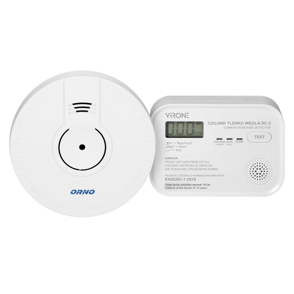 Zestaw składa się z dwóch detektorów: tlenku węgla DC-3 i dymu OR-DC-630. DC-3 to nowoczesne urządzenie alarmowe zaprojektowane do ciągłego monitoringu stężenia tlenku węgla (czadu) z podświetlanym wyświetlaczem LCD. Czujnik dysponuje przyciskiem TEST, który pozwala sprawdzić poprawność działania czujnika. Jest zgodny z normą EN 50291-1:2018 dla domowych detektorów tlenku węgla. Średni czas żywotności czujnika wynosi 10 lat. OR-DC-630 to urządzenie przeznaczone do monitorowania zamkniętych pomieszczeń pod kątem obecności dymu oraz do wczesnego wykrywania pożaru. Czujnik fotoelektryczny wykrywa widzialny dym powstający w bezpłomieniowym, początkowym stadium pożaru, powiadomienie optyczne i dźwiękowe, przycisk TEST pozwala sprawdzić poprawność działania czujnika, sygnalizacja słabych baterii, zgodność z normą EN 14604: 2005 + AC1: 2008 potwierdzone przez jednostkę certyfikującą BSI-KM514007.