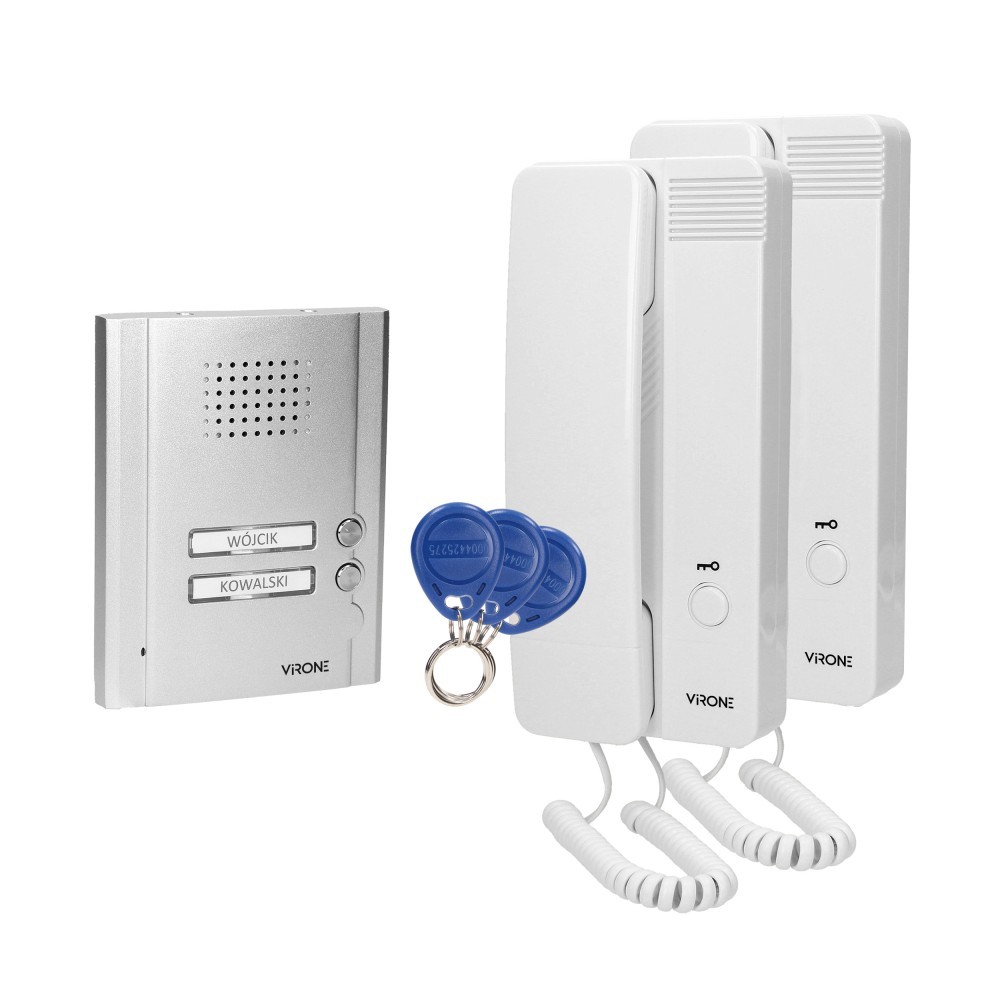 Zestaw domofonowy dwurodzinny, montaż podtynkowy, aluminiowa obudowa kasety zewnętrznej z miejscem na nazwisko, otwieranie rygla za pomocą breloka zbliżeniowego, unifon posiada wbudowany zasilacz i przewód zasilający, elektrozaczep nie wymaga dodatkowego zasilania.